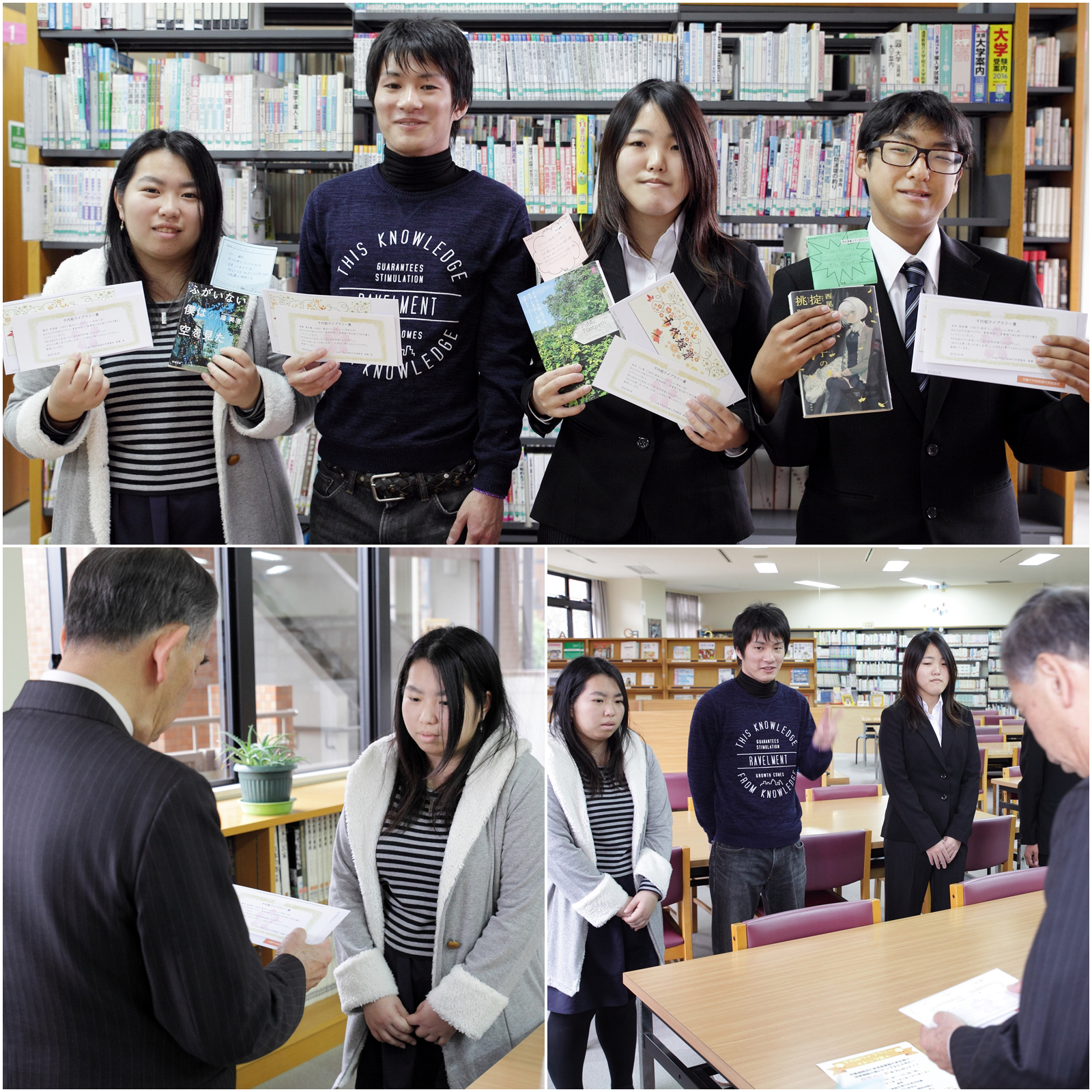 今回一位の学生は大学祭など忙しい時期ながら、16冊ものPOPを書いてくれました。 TOP3までの学生には、学園理事長から表彰状と、「これからも様々な本との出会いを」との気持ちを込めて、 図書カードが贈られました。