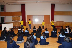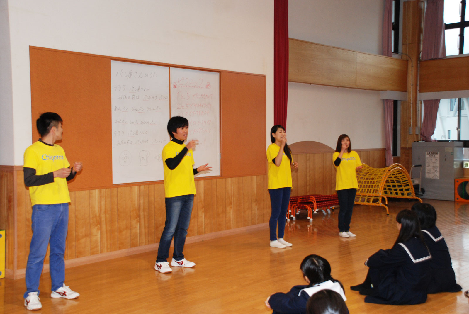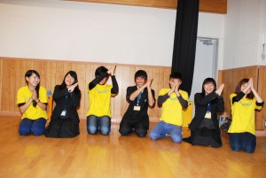 11月19日大阪暁光高校の学校見学会で幼児教育を志望する中学生に幼児教育の楽しい授業内容を紹介しました。学生たちが短大で学び、実習でも実践してきた手遊びやリズムに合わせて踊ったり体を動かしたりすることを中学生に教え、一緒に楽しみました。参加した中学生の中からぜひ千代田短大に進んで幼稚園や保育園の先生になりたいという声がたくさん聴かれました。