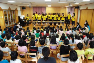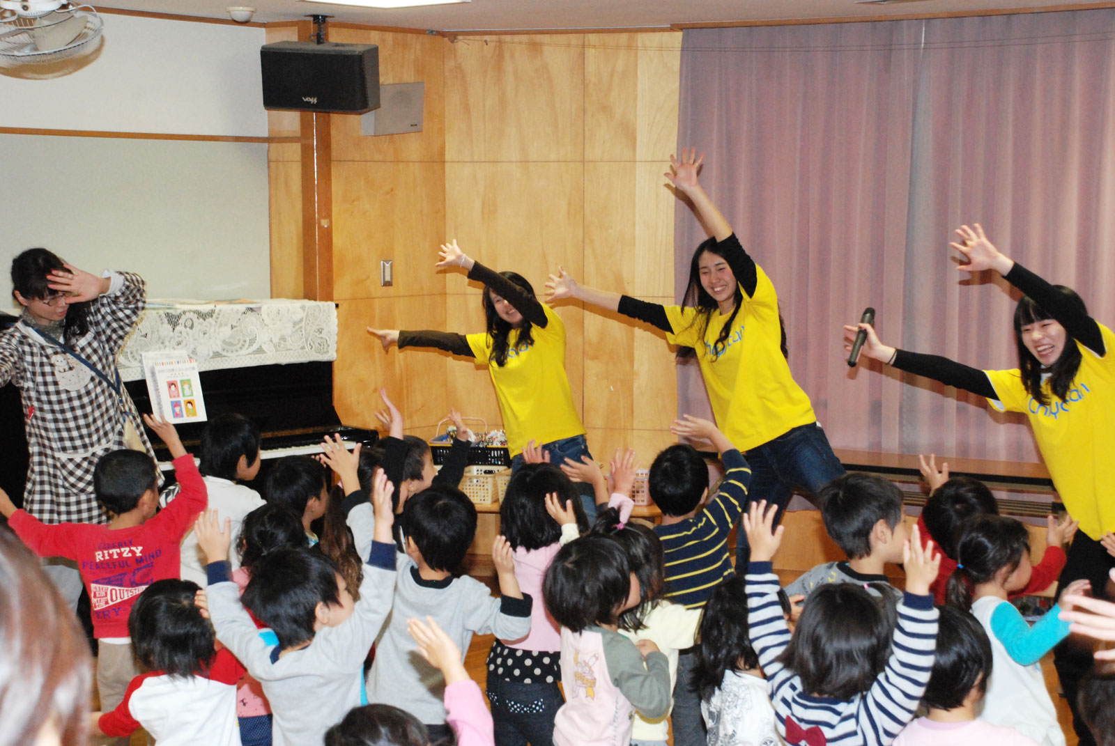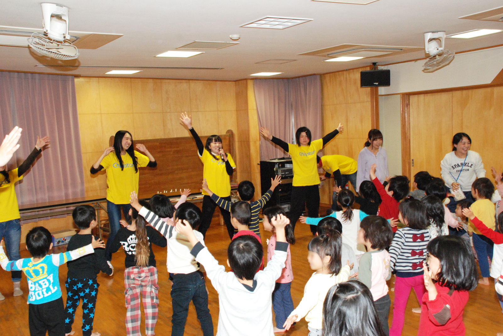 12月1日、河内長野市立千代田台保育所で、幼児教育科2回生の子ども音楽療育コースが「音楽プログラム」実習を行いました。学生たちは、歌やカスタネットやすず、マラカスを使って合奏をしました。最後には元気よく音楽に合わせた体操!子どもたちのパワーに圧倒されそうになりながら、しっかりと学習してきたことを実践してきました。