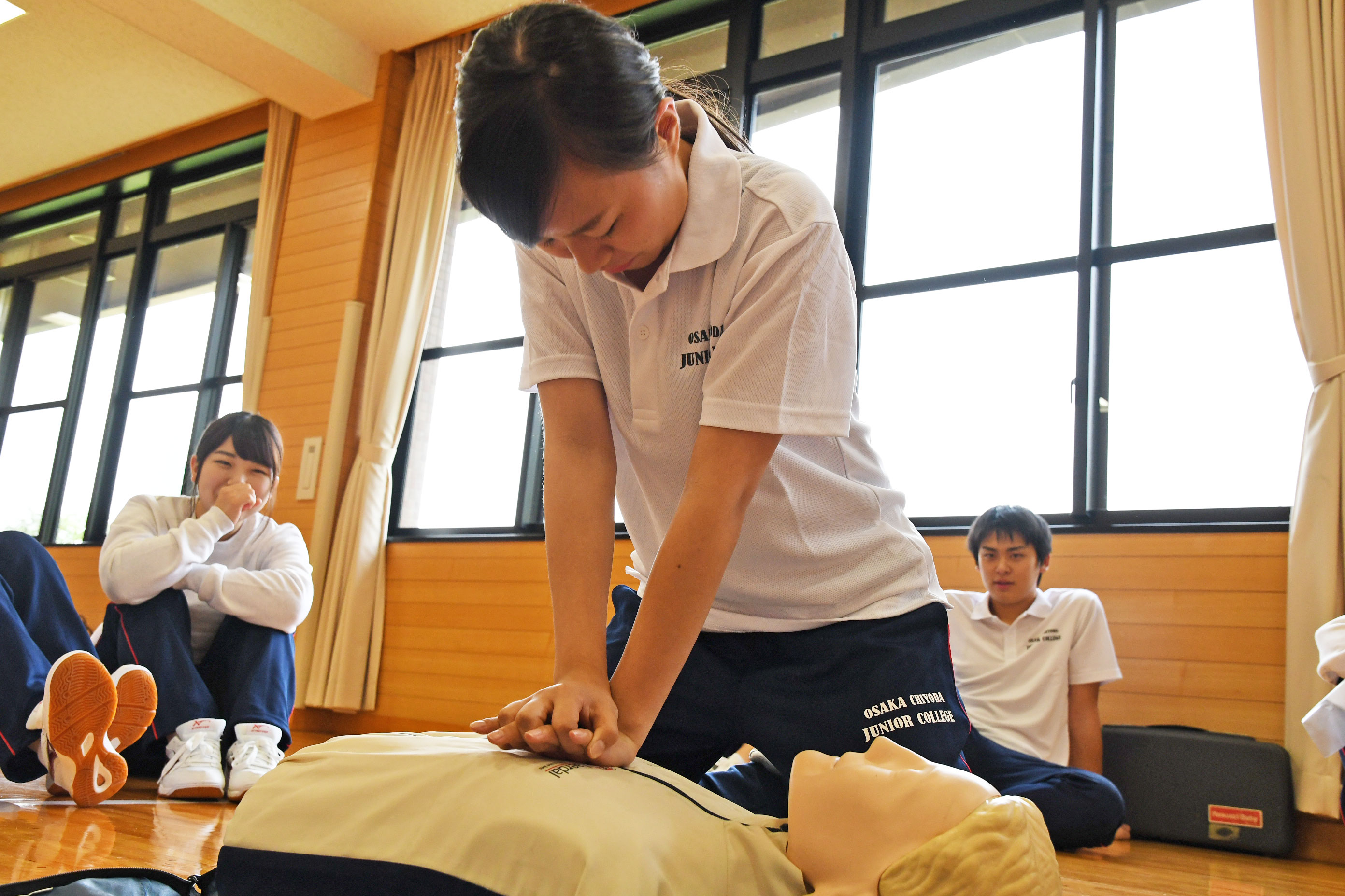 5月31日3限目の子どもの保健Ⅱの授業で、河内長野の救急救命士さんに来ていただいて救急救命の講座を開きました。幼児教育Ⅰ回生の学生たちが3つのグループに分かれ心肺蘇生の方法、AEDの使い方などの講習を受けました。保育の現場で働くためにも絶対に身につけておかねばならない知識です。一人一人真剣に取り組んでいました。