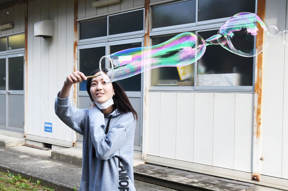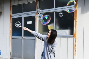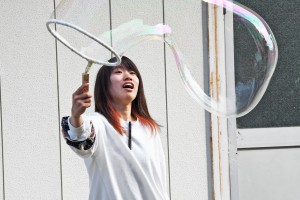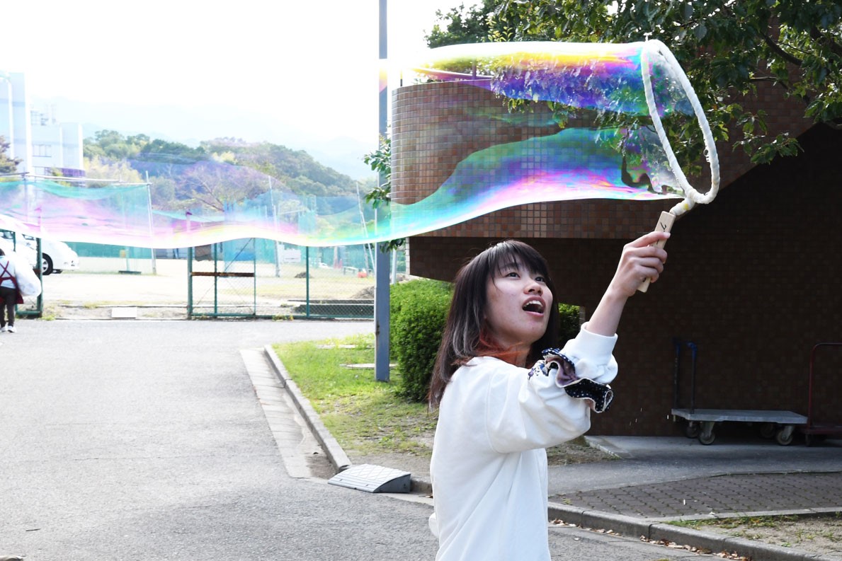 現代生活の科学の授業でシャボン玉を作りました。シャボン玉の液は水と界面活性剤を混ぜて作ります。界面活性剤は水と仲良しの部分と油と仲良しの部分を両方持っています。水に界面活性剤を加えることで水分子が集まろうとする性質を弱め薄い膜を作ることが出ます。このシャボン玉液にPVA(ポリビニルアルコール)の洗濯のり加えると巨大シャボン玉づくりの液になります。シャボン玉が壊れてしまう原因の一つに薄い膜から水が蒸発してしまうことがあります。PVAの分子は「-OH」(ヒドロキシル基)という構造をたくさん持っていて、水分子を引き付ける性質があり、そのため水が蒸発しにくくなり大きなシャボン玉ができると考えられます。