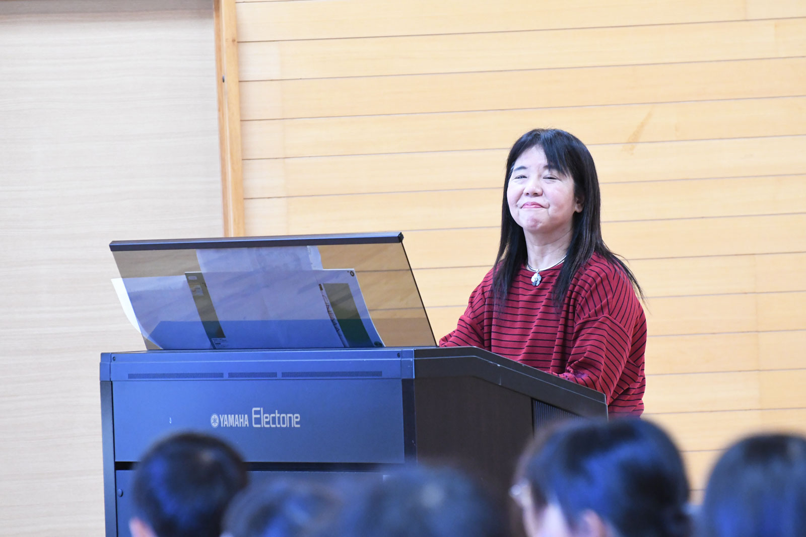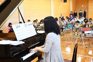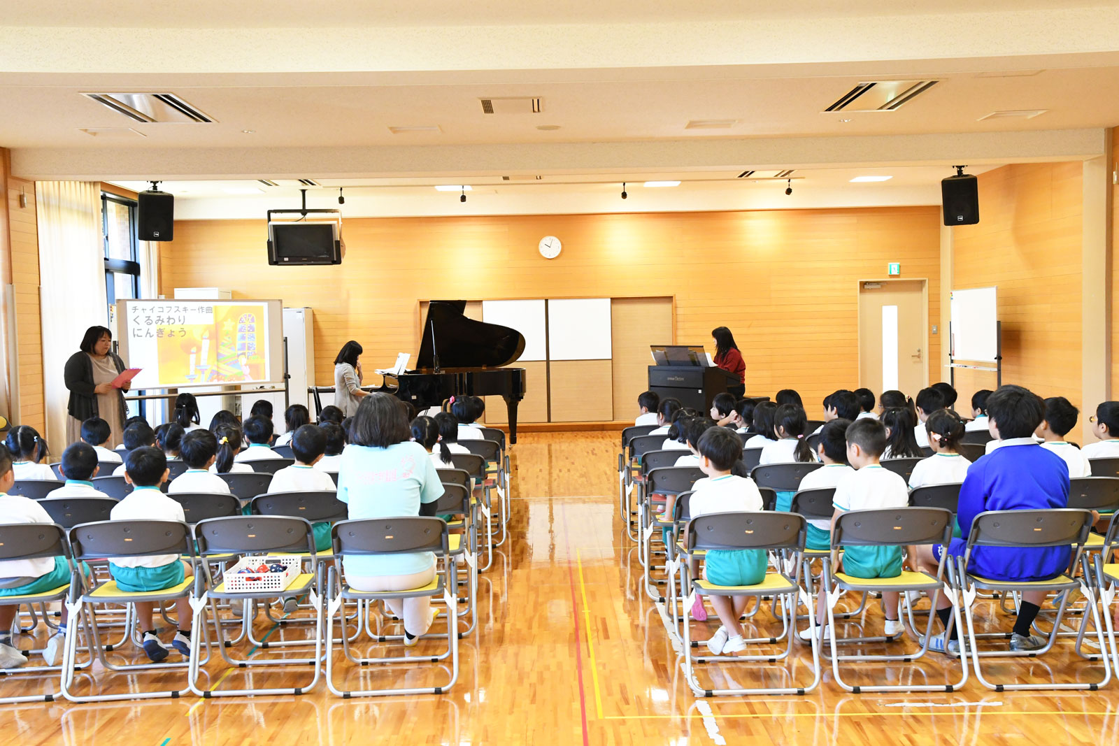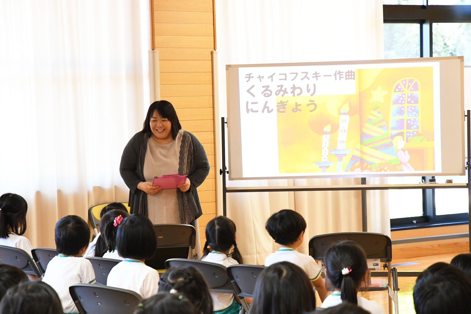 栗川先生が映像を使って絵本「くるみ割り人形」を語り、お話の進行に沿ってチャイコフスキー作曲「組曲くるみ割り人形」より数曲を寄先生(エレクトーン)、山本先生(ピアノ)によるデュエット演奏でお届けしました。園児たちもお話と音楽にすっかり魅了され、あっという間の楽しい時間が過ぎました。