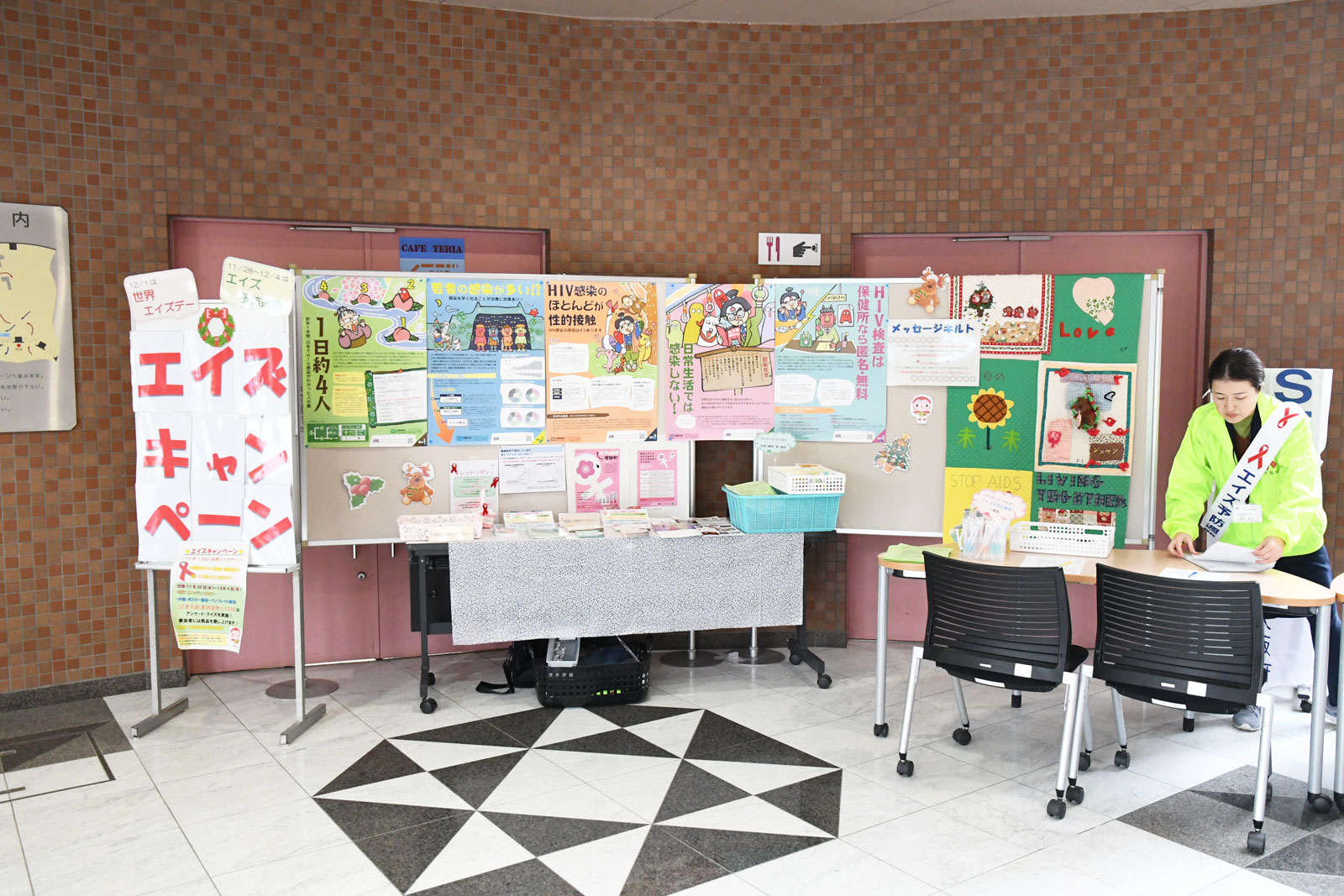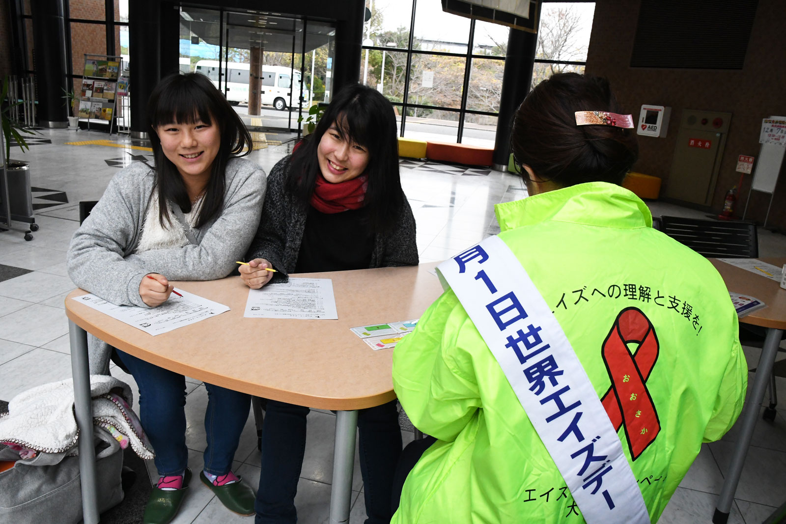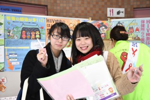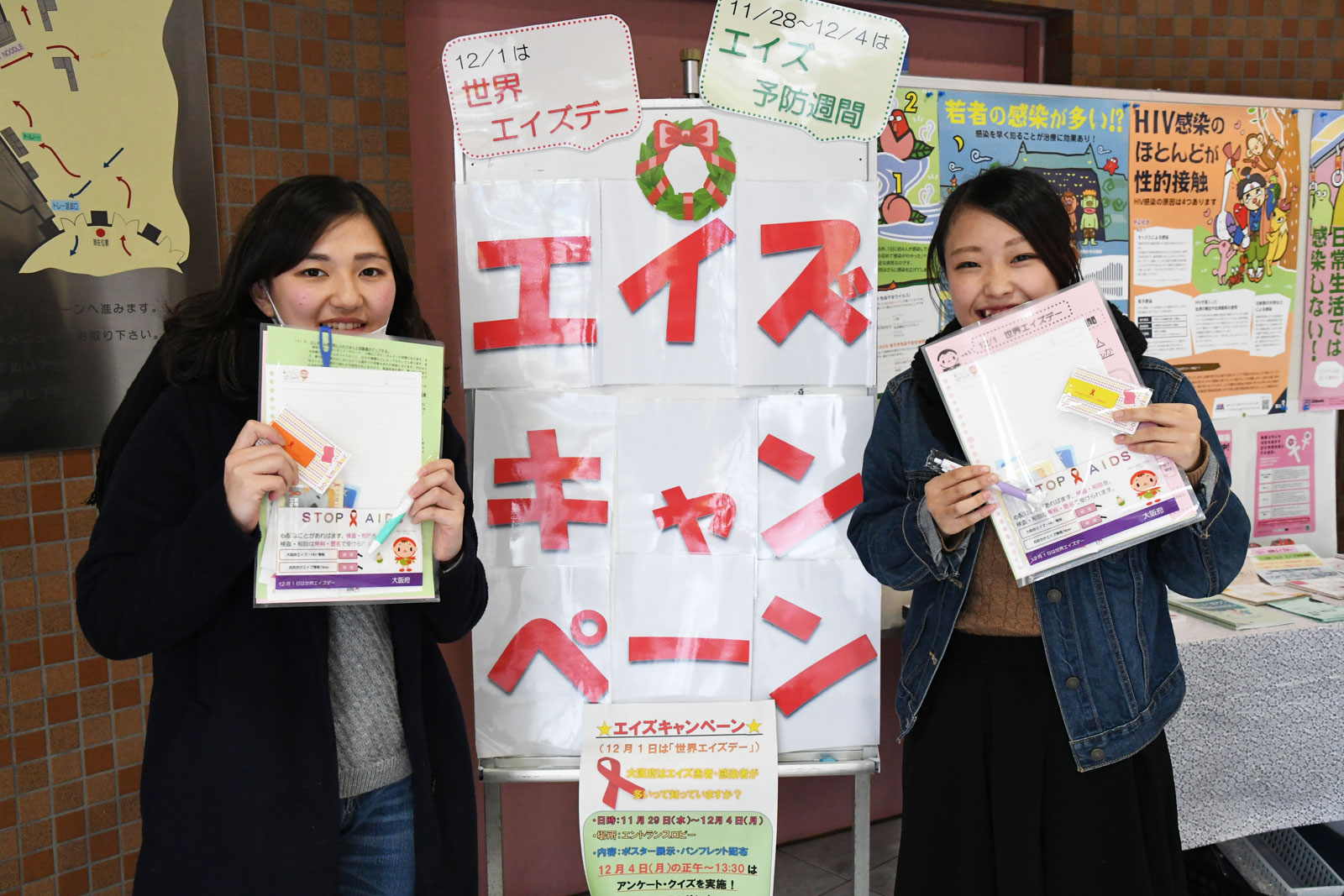 12月1日は世界エイズデー、11月28日~12月4日はエイズ予防週間です。4日、富田林保健所の方2名が来校、エイズキャンペーンを行いました。学生たちにアンケートを行い正しい知識を知ってもらうよう取り組みました。アンケート協力者は素敵なグッズをいただきました。