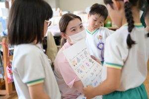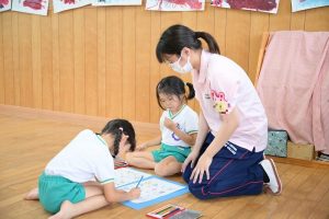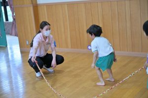 2回生は、ただいま3週間の幼稚園教育実習を行っています。実習も折り返しで子どもたちとも仲良くなり楽しく学んでいるようです。設定保育の準備も着々と進めているようです。付属幼稚園に実習に行っている2人は合宿保育が最後に控えています。