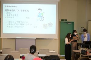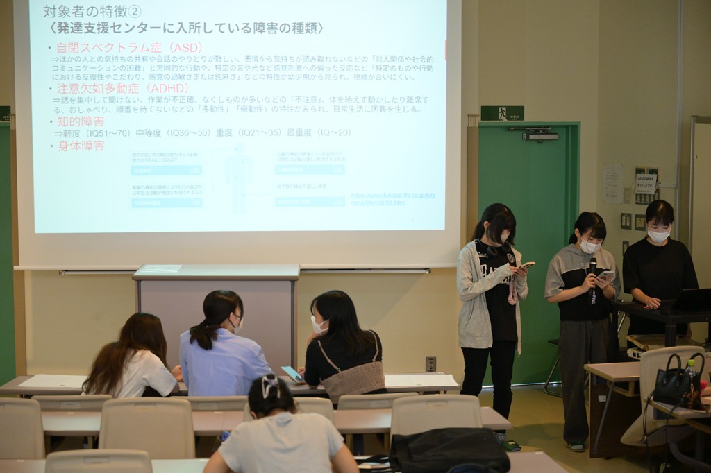 15日の社会的養護Ⅱの授業では、5月に行った施設実習のまとめを各グループでスライド発表を行いました。実習で学んだことを5分間で発表し、相互評価を行いました。