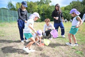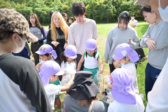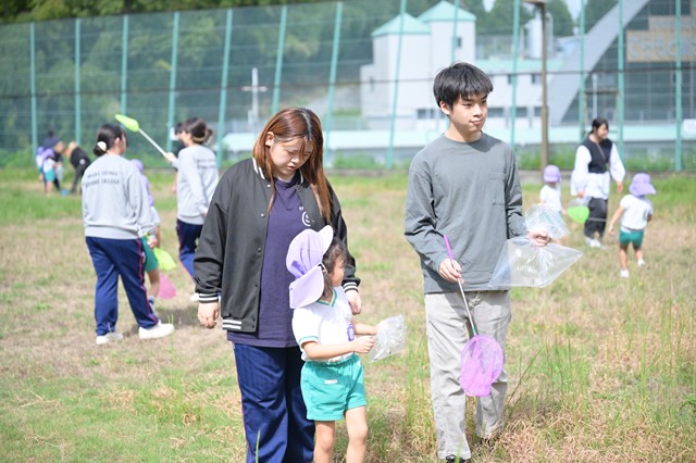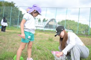 9月30日、保育と環境の授業を受けているABクラスの学生と附属幼稚園の年長組の園児が、短大のグランドで虫取りをしました。トノサマバッタやショウリョウバッタ、トンボも捕まえていました。虫の苦手な学生も園児と一緒になって虫を追いかけていました。