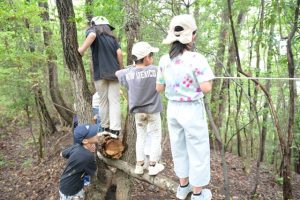 10月20日、ちよたんの森に高向学童保育の児童39名が遊びに来てくれました。高向学童保育には3名の千代田短大卒業生が務めています。木登り、ロープ渡り、斜面滑り、的当てなどちよたんの森を十分楽しんでいただきました。ちよたんの森は、教育関係施設に開放し利用していただいています。お問い合わせください。
