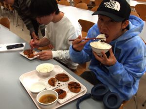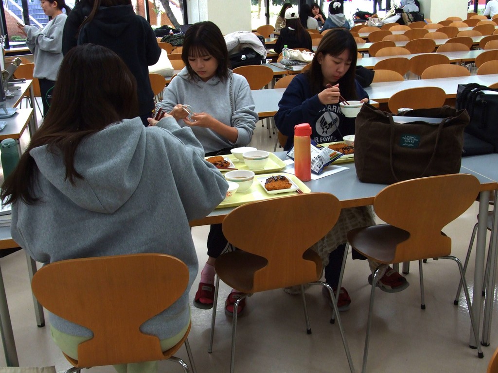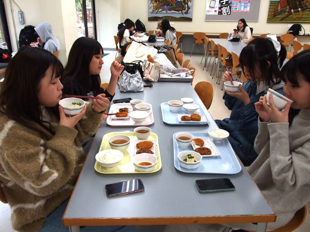 今日のメニューは、チキンカツ・牛肉コロッケ・冷や奴オクラのせ・味噌汁・ごはん。学生の食 レポによると「チキンはジューシー」「コロッケは、ジャガイモの甘味がありサクサク」「オク ラの食感がよい」とのこと。好評でした。 本学は、学生生活応援のため週2回無料のちよたんランチを提供しています