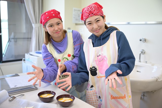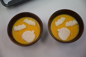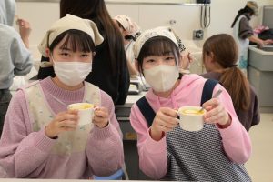 10月28日の食と栄養の授業はかぼちゃを使ってハロウィンポタージュスープをつくりました。パンをかぼちゃとこうもりの形にくりぬいてスープに浮かべました。