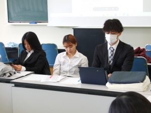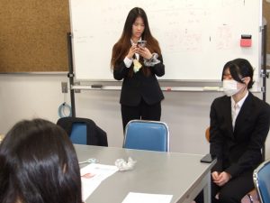2回生が、教育実習・保育実習・施設実習で学んだことを、1回生の前で発表します。実習で学 んだ内容に加えて、発表の音量・スピードなど表現能力についても評価の対象になります。どの グループからも、発表者の緊張感が伝わってきました。