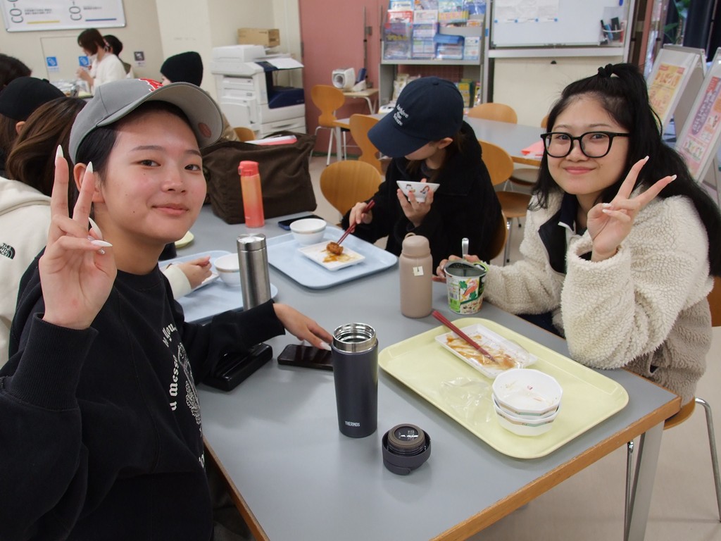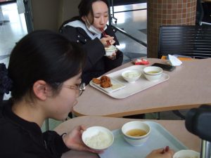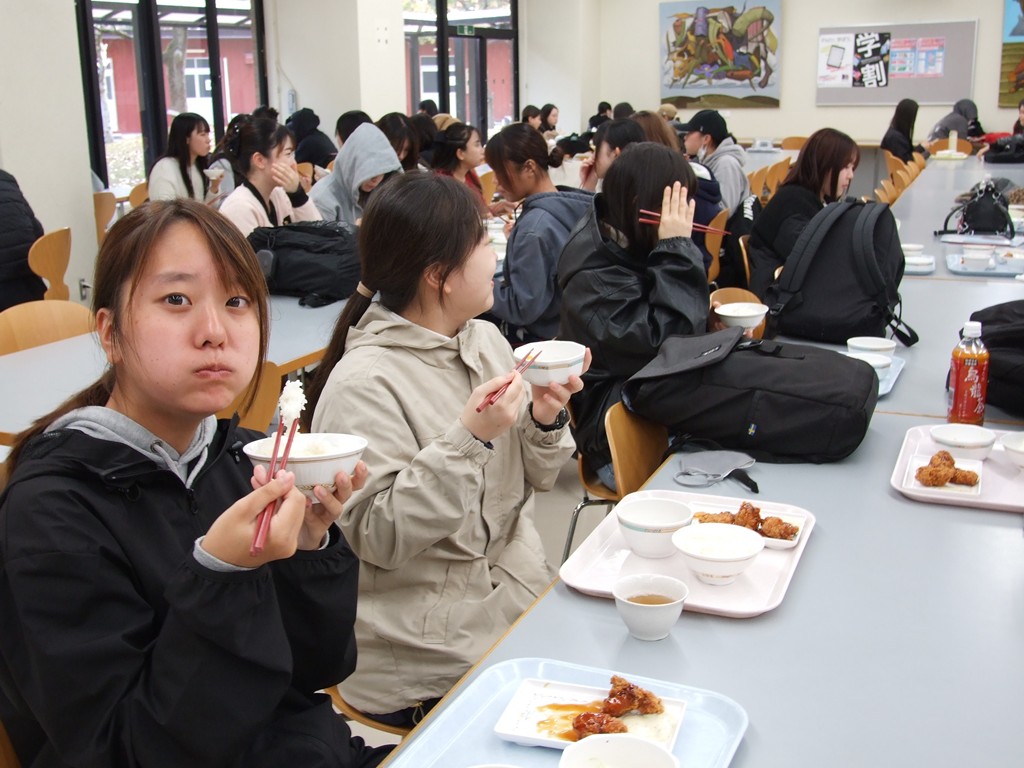 今日のランチは、唐揚げ南蛮、カボチャのサラダ、ごはん・みそ汁です。唐揚げには、タルタルソースと甘酢餡がついており、「このメニューが一番好き」という学生もいました。「鶏肉はジューシーだけど、衣はカリッとしている」とのことでした。