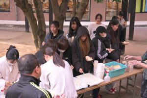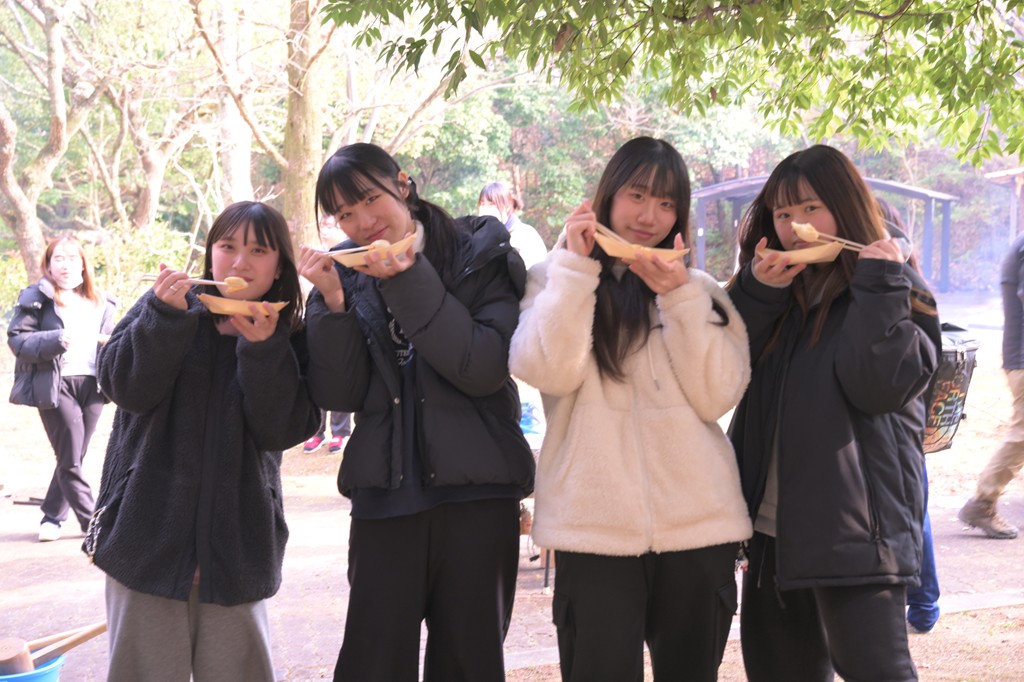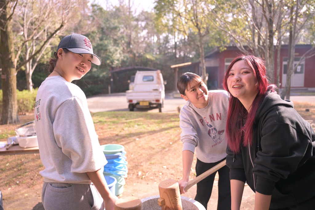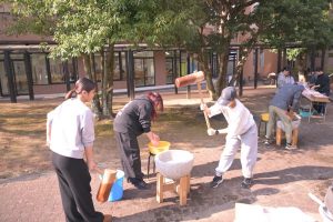 1月16日、餅つき大会をしました。2限目から冒険あそび場ゼミの2回生が準備をし、今年は学生だけでもち米をこねるところからつき上げるところまでできるようになりました。つきたての餅を丸めて砂糖醤油やきな粉などをつけておいしくいただきました。保育者になっても子どもたちと一緒に餅つきができるスキルを身につけました。