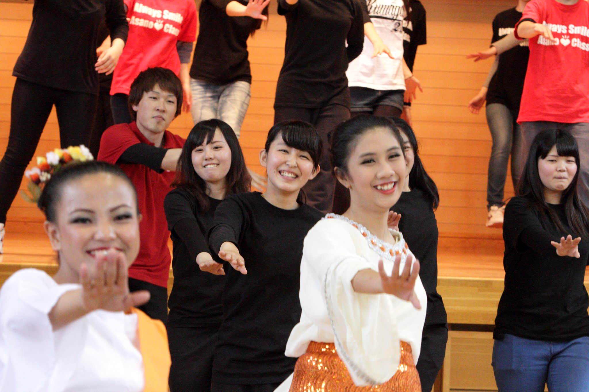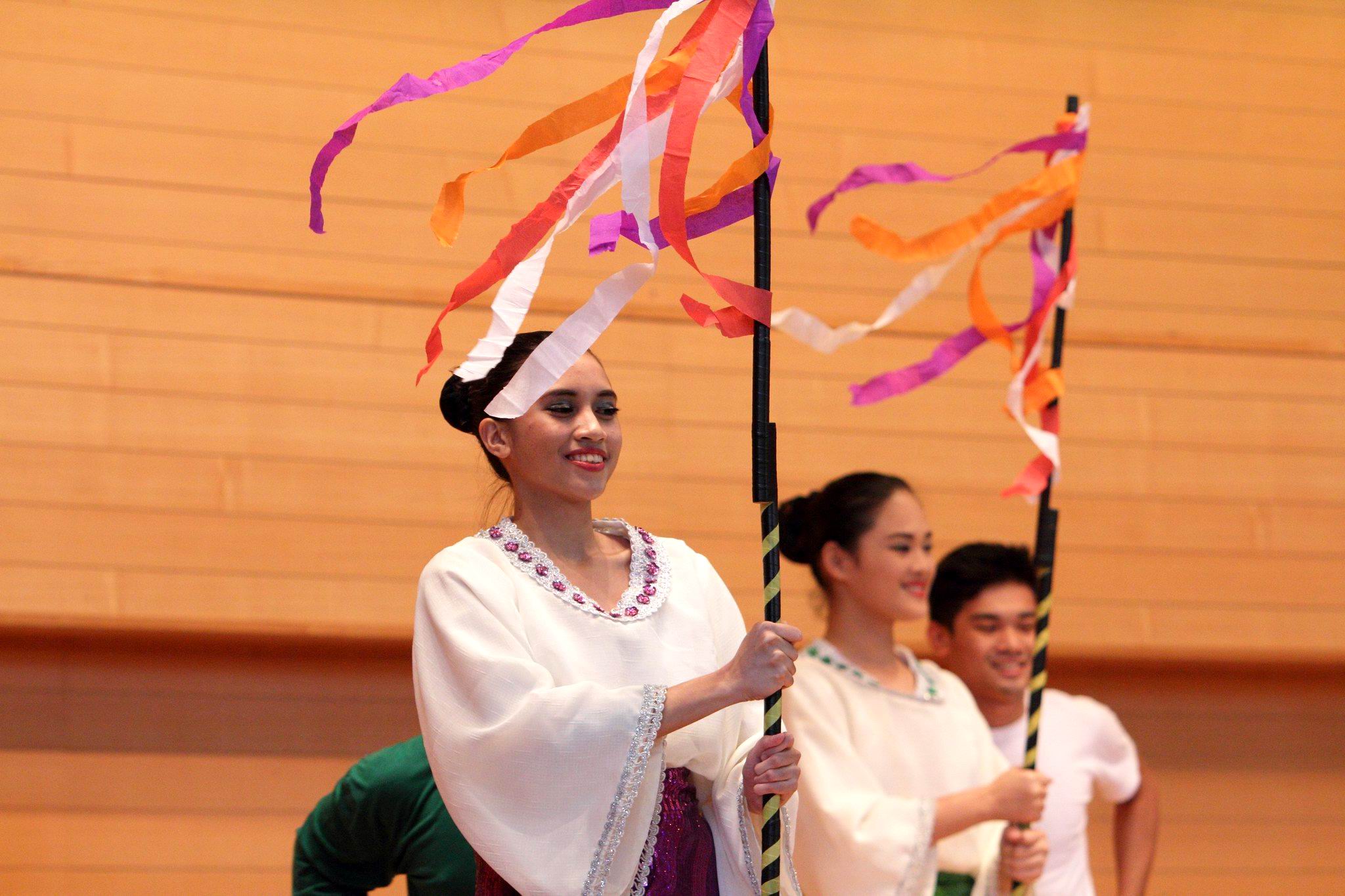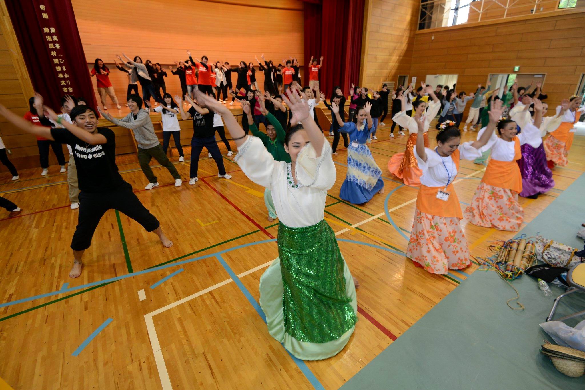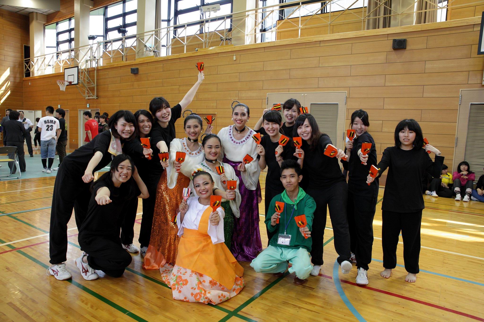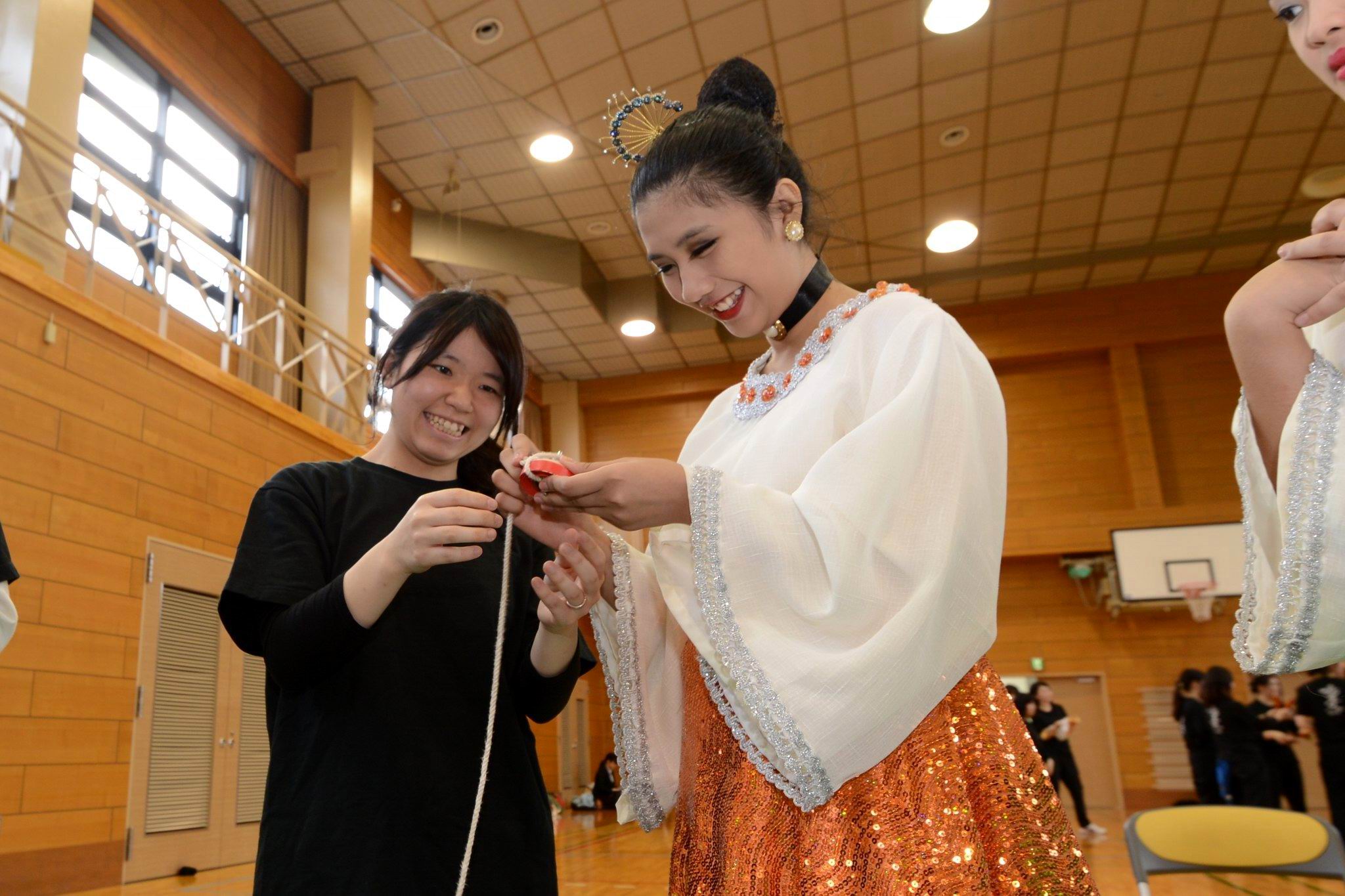 日本の文化の紹介として、こま回しや竹馬、鳴子踊りで交流。また本学のボディーパーカッションとレトラン学院の学生さんたちのフィリピンの民族舞踊をお互いに披露。交流の最後には、両校の学生全員で民族舞踊を踊り、大変な盛り上がりとなりました。