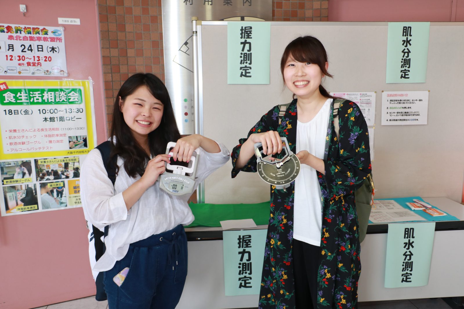 5月18日昼休み、大学生協主催の食生活相談会が行われました。体脂脂肪率測定、肌水分測定、アルコールパッチテスト、疑似酒酔い体験コーナーなど多彩な企画が行われました。河内長野栄養士会から2名の栄養士さんが来ていただき、食事内容のアドバイスを受けました。日頃の食生活を振り返り、健康について考えるよい機会となりました。