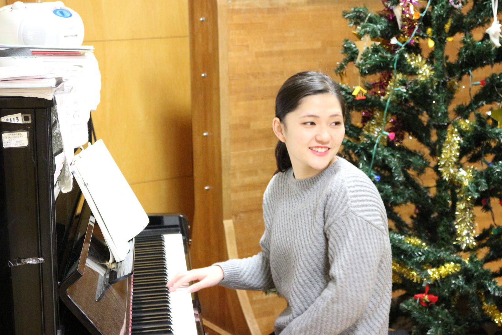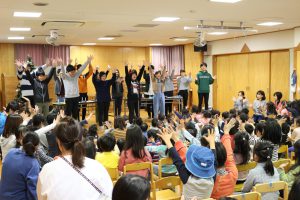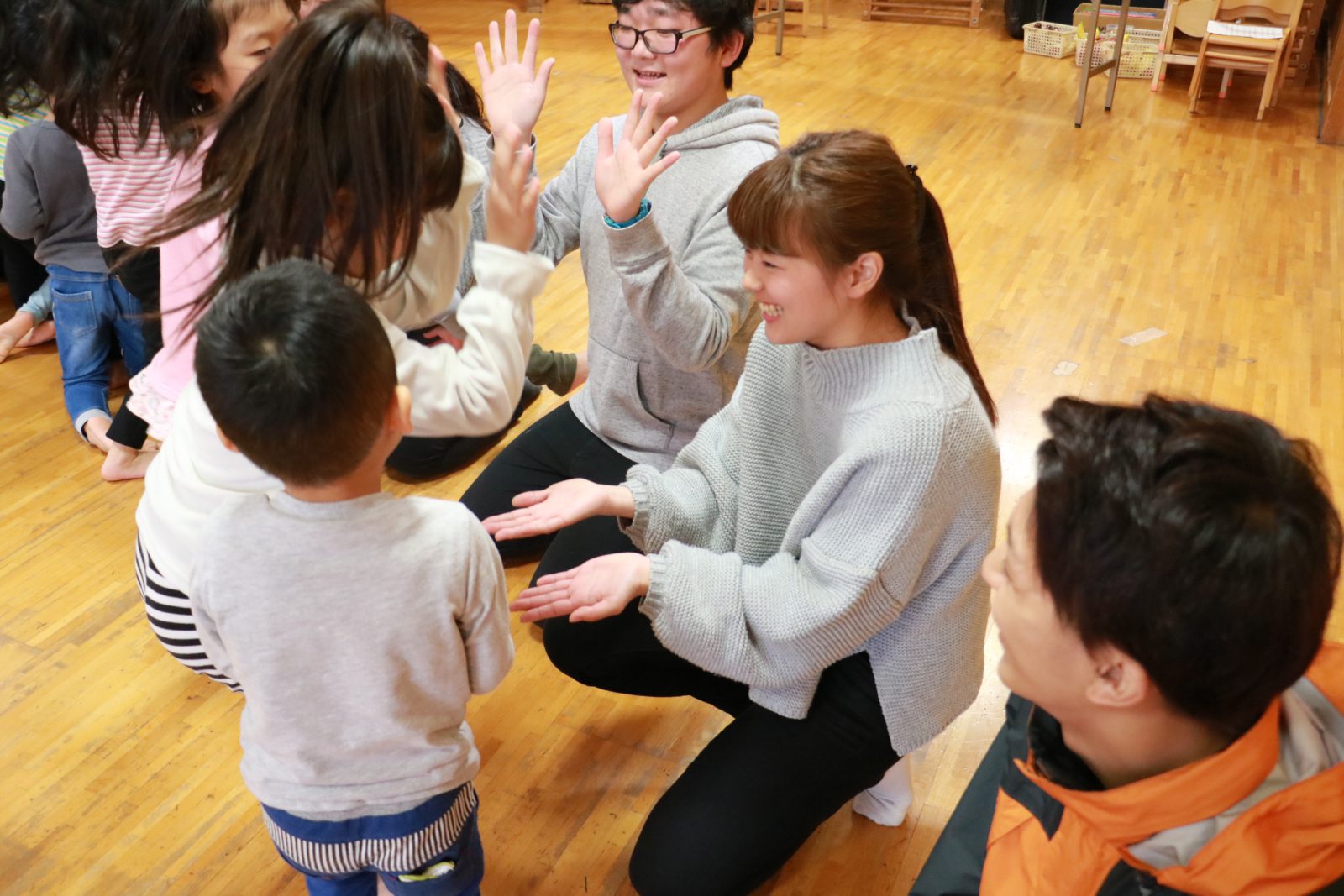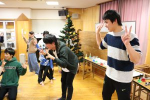 12月10日、幼児教育コース2回生の子ども音楽療育を選択している学生たちが河内長野市立千代田台保育所で音楽プログラム実習を行いました。園児と一緒にベルやトーンチャイムを使って合奏をしたり、曲当てクイズをしたりして楽しみました。最後に「エビカニクス」を楽しく歌って踊りました。