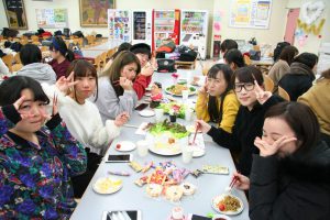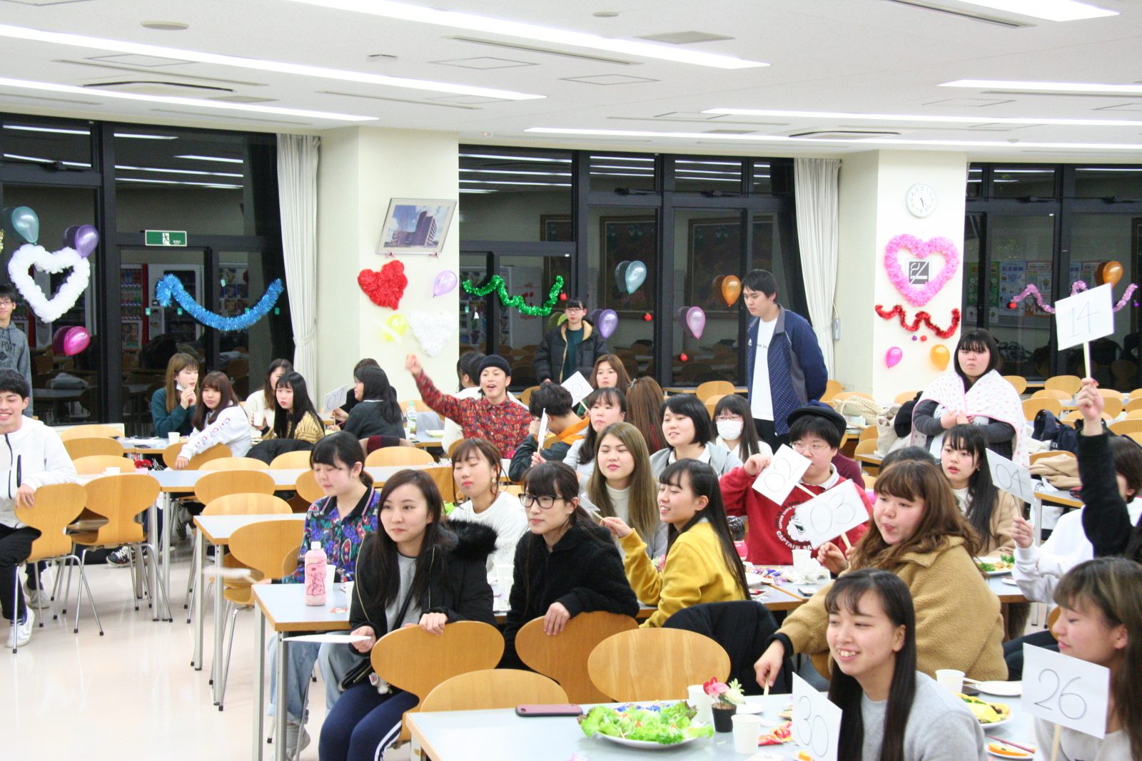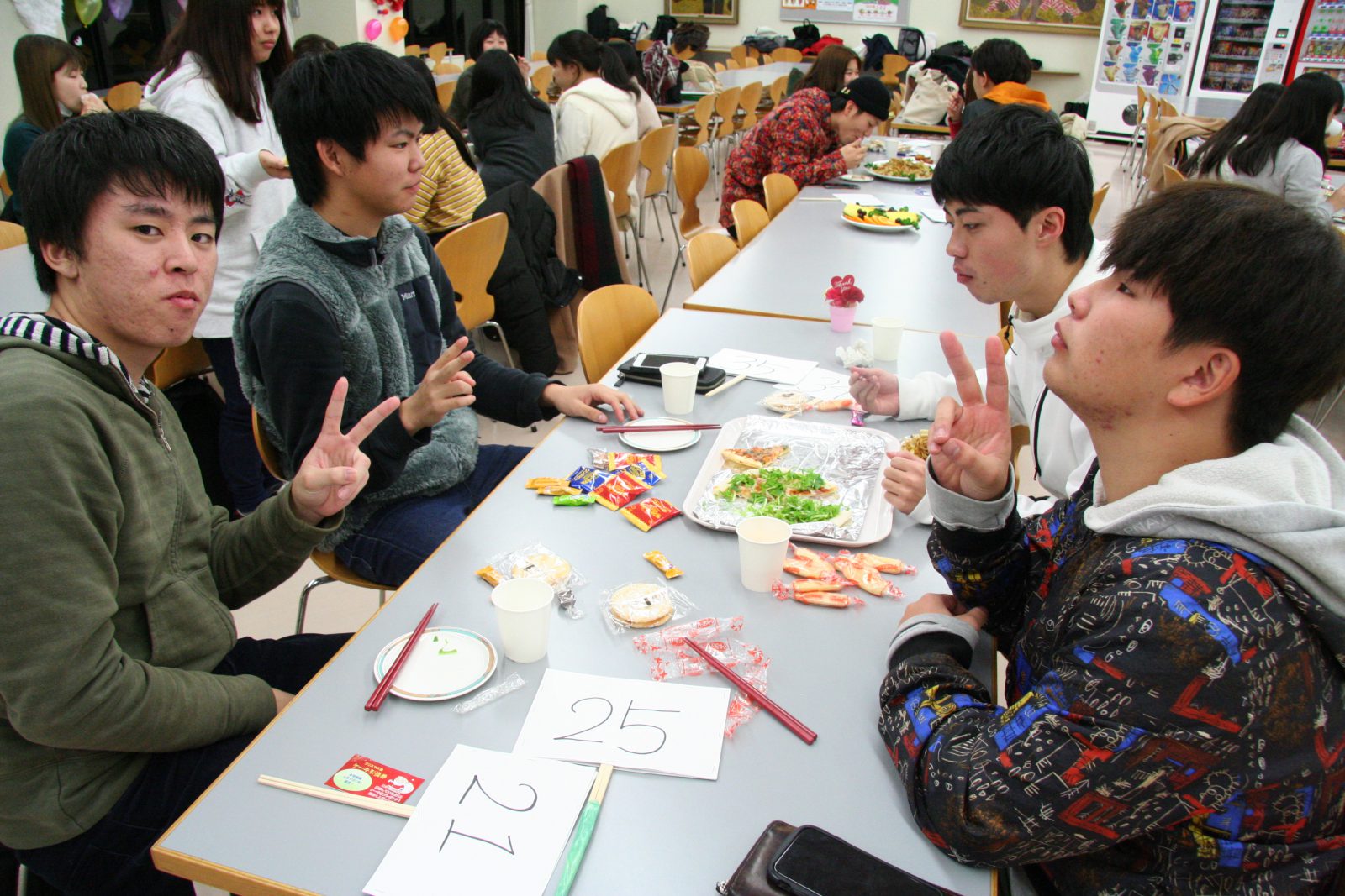 12月17日、学生自治会主催のクリスマス会が開催されました。学生自治会が企画して準備してくれました。おいしい食事や、クリスマスケーキをみんなで食べ、豪華な景品のある音当てクイズなど、楽しい時間となりました。