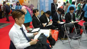 会場では沢山の介護福祉に関する企業展示、セミナー、講演会等の催しが行われており、当学学生達はそれぞれに分かれ積極的に体験したり、説明を聞いたり、質問を投げ掛けたりしながら、ところせましと取り組んでいました。