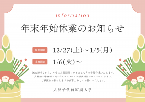 誠に勝手ながら、本学は 12/27~1/5 年末年始休業いたします。